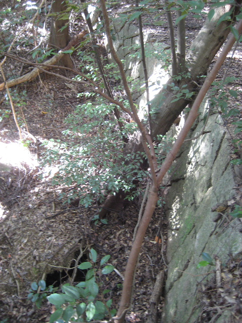そこへ至る道の石積みの下には、また別の樹木が根こそぎ倒れかかって洞を生じていた。