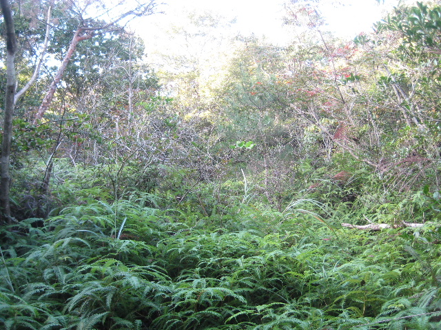 シダはズボンを攻撃する「ほいと」を持たない。その点は心配ないが、足元が見えない地面を進攻するのは如何にも気持ちが悪かった。それでも膝下くらいまでなら何とか受忍できるので、慎重に進んだ。どうも先の方が開けているように思われるのだ。その先に未知の物件が少しでも見えかけたなら、万障繰り合わせて突撃する用意があった。