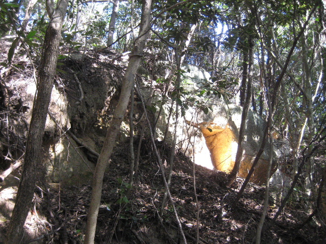 他方、そういった決めつけによって重要な遺構を見落としていた可能性は拭い去れない。その岩までの斜面は非常に急だったが、足掛かりの良い地面で頼りになる枝も豊富にあったのでさっそく接近することに。