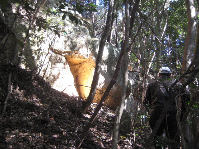 もっとも正直な話、私はその場所に何か特筆すべき人工物が存在することに否定的だった。もっとも岩の表面が明るく見える角度と強さで日の光が降り注いでいることと、周囲の藪が暗いことによるコントラスト効果だろう。