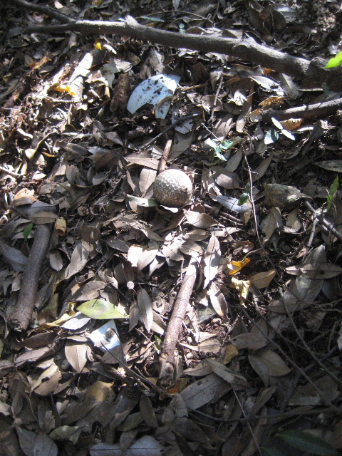 茶碗の欠片に混じって何故かゴルフボールまでも…「ガラスが多いな…売店などがあったのかも知れないな。」