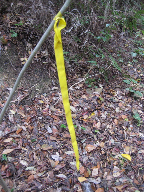 索道のある入口などにはこうした目印が枝に結びつけてあることが多い。しかしここから先にかつて存在した鉄塔と言えば宇部興産(株)窒素線だけである。