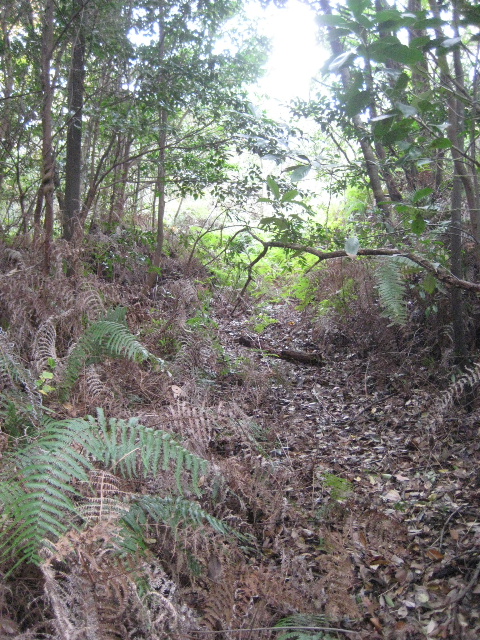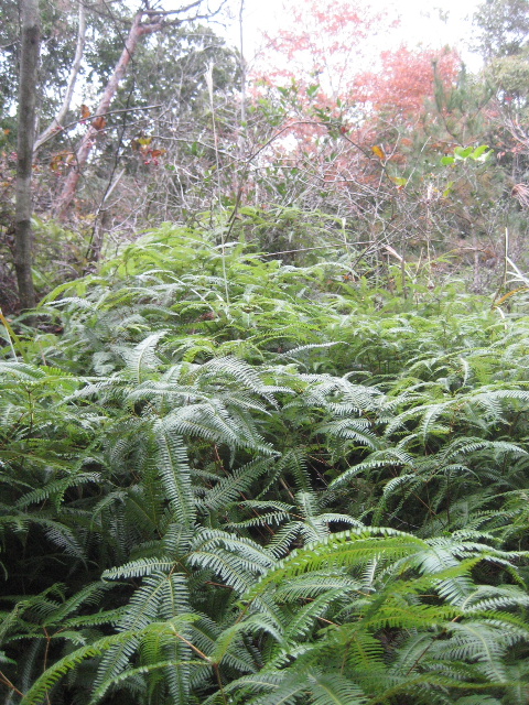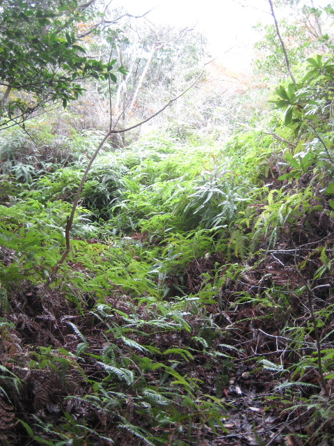 シダ藪の先にはちょっと開けた場所があるように思える。しかしこの辺りで既に胸元まで隠れるほどのシダ藪の深さで、こんな足元も分からない場所を盲目状態で突き進めるほど肝は据わっていない。