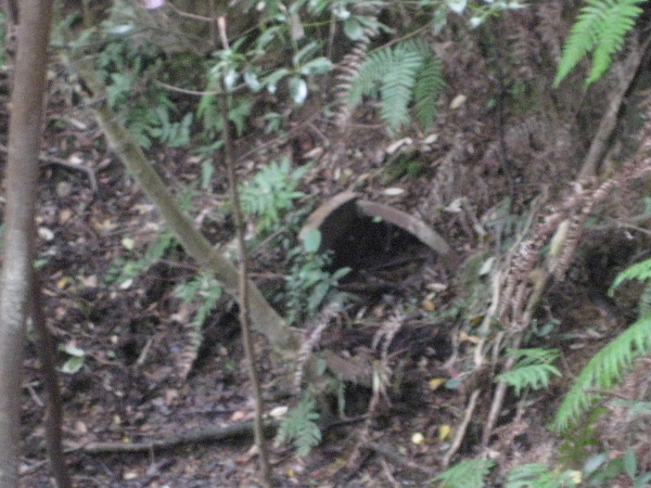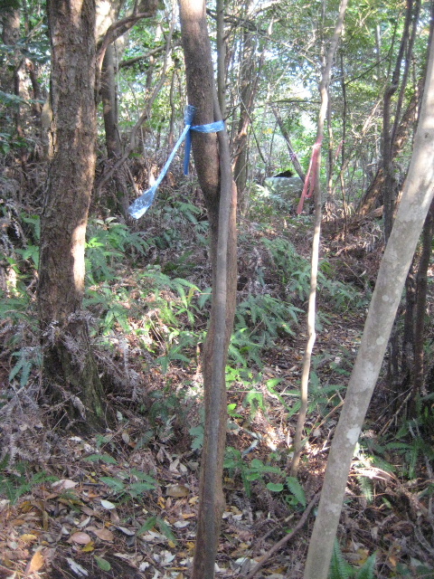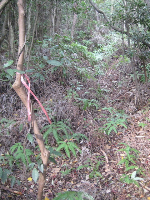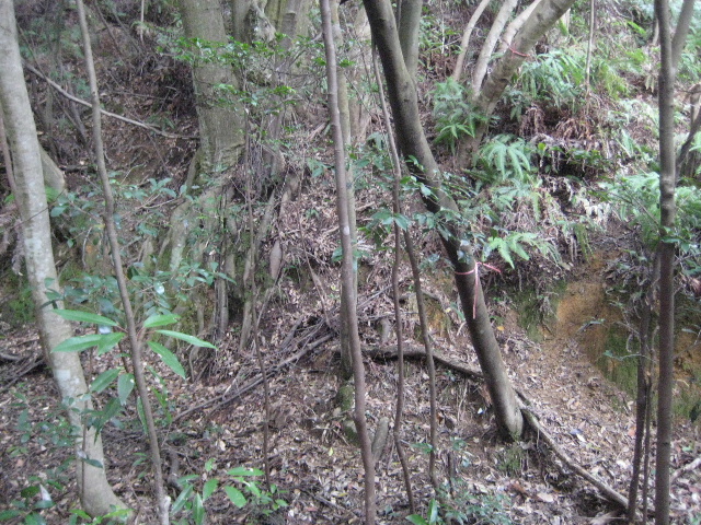 登るところに赤いテープが巻かれた樹があり、赤土が露出しているのでこれも目印になる。段差があるが太い幹が手がかりになるので昇降にそれほど困難はない。