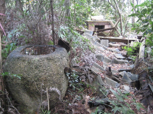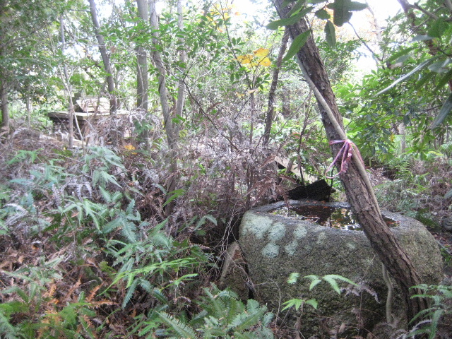 倒壊御堂の手水石が見えてきた。