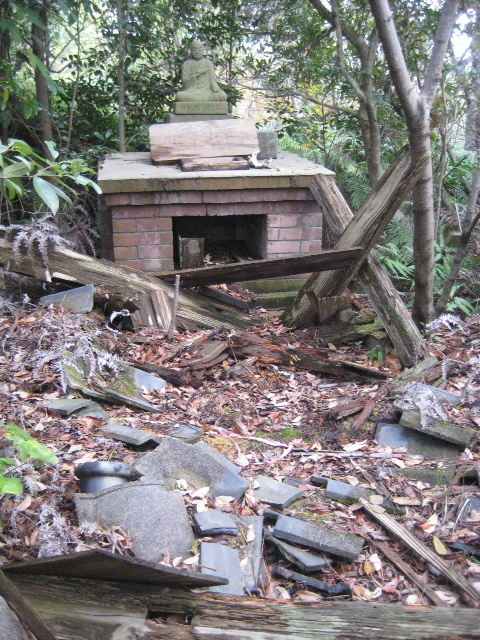 昨日は雨だったせいか、御堂の残骸や瓦などあらゆるものが濡れていた。