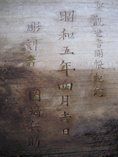 1. この扁額は、表側にあった名前から彫刻者の身内の方を割り出すことに成功し、現在は現場から搬出され無事関係者の元へ返還されています。この救出劇の裏には地元の自治会やネット上のツールを用いて情報伝播に協力して下さったお陰があります。したがって現地にはもう扁額はありませんが、個人的にはこの扁額の彫刻者にとって一番望ましい処遇だったと安堵しています。