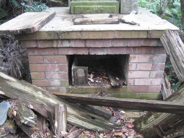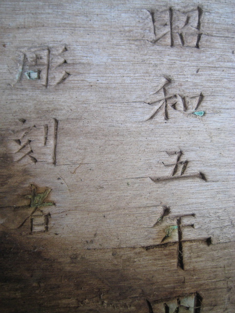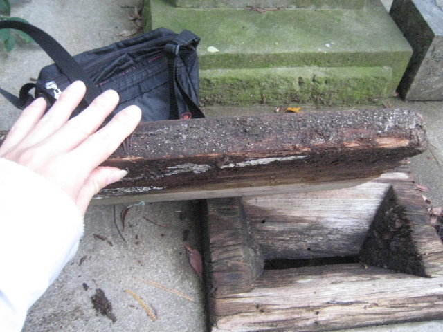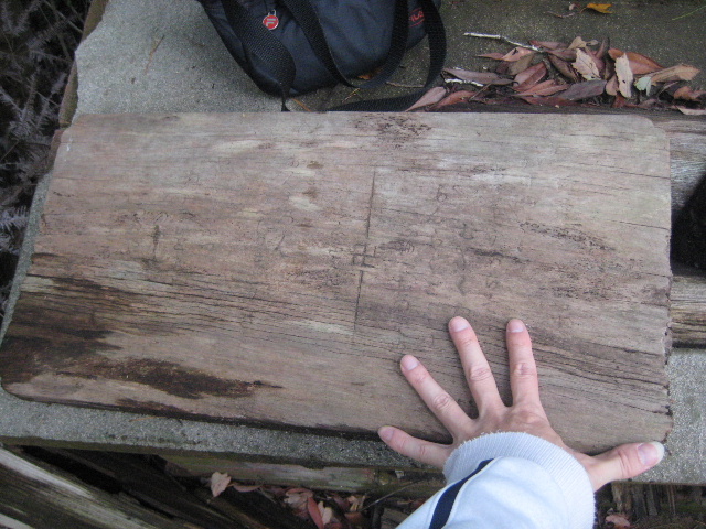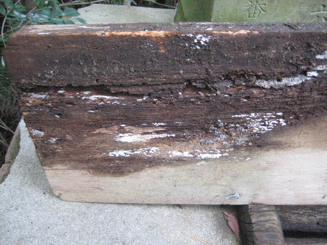 扁額の状態は傍目にも良くなかった…いや、ハッキリ言えば非常に悪かった。上の写真でも見てとれるだろう。濡れては乾き、あるいは乾く間もなく再び濡れ、腐朽菌が増殖して分解が進行していた。合同調査会で扁額を見つけたときは文字が刻まれている部分のみを撮影していた。そのため写真を撮っていない朽ちたこの部分の状態が分からなかった。