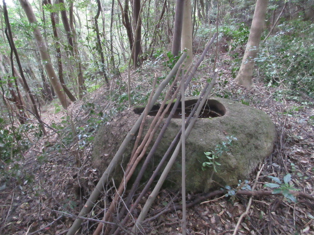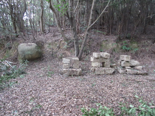 初めてここを見つけた後に藤山八十八箇所の倒壊御堂で同じ手水の岩を見つけたことから、同様の御堂を造ろうとする途中だったか、壊れてしまったため残骸を片付けて石材を一箇所にまとめて積んだのでは…と考えていた。