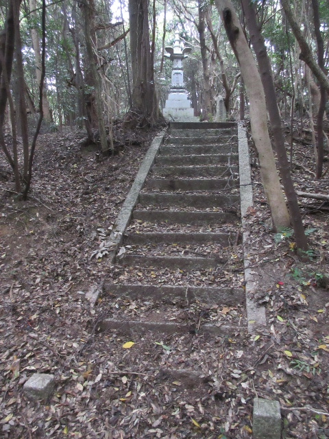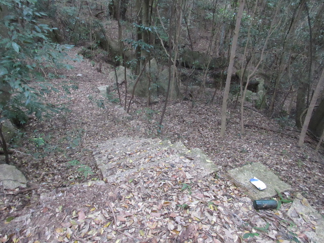 位置的には宝篋印塔へ向かう3連続石段の途中にある平場だ。初回訪問時には微かに手水の岩が見えることで何かあるらしいと気付く状況だった。今は低木が刈り取られているので石段を経て横からこの平場へ到達できた。