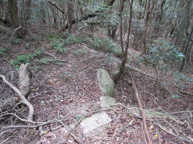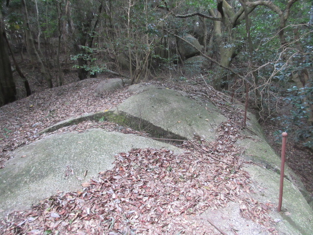 少し離れて撮影。石材の横に大きめの岩があったが、加工された形跡はなく自然のものらしかった。この岩の存在は初回訪問時は枯れ草に隠れてまったく分からなかった。