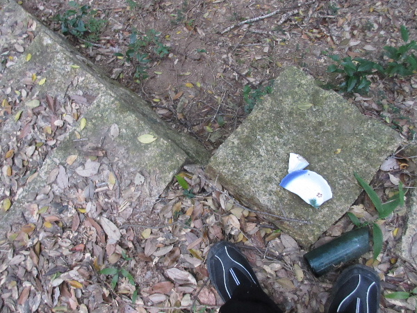 石段の上には清掃過程で見つけ出されたと思われる割れた皿と瓶が置かれていた。