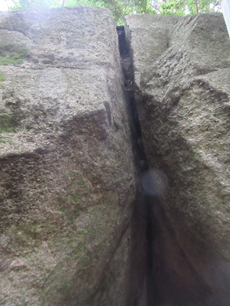 上部は10cm程度の隙間しかないが、下へいくにつれて次第に幅が広がり、地面に接する辺りでは人が潜り込める程度の洞穴になっている。