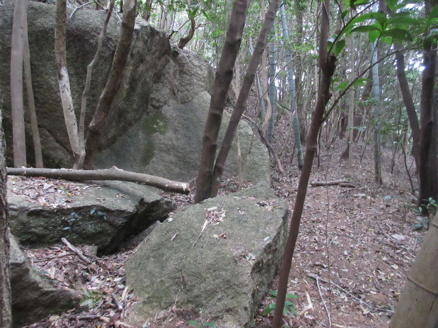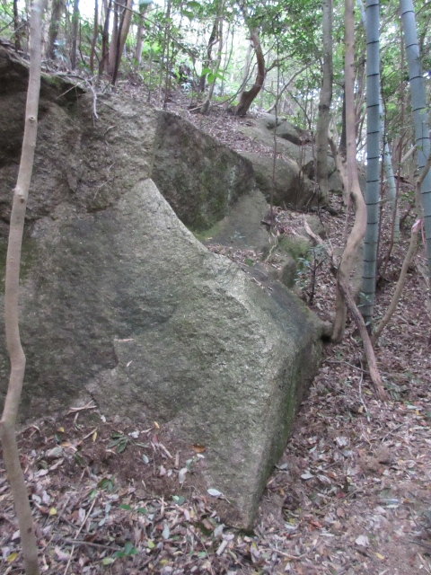何かを設置するのに邪魔になった…などの理由が考えられないので、小割りにして石材を調達していたのだろう。その場合小割りにした岩を何処に使ったか、どういう器具と手段を用いればこのような形状に割ることができるのかという疑問がある。