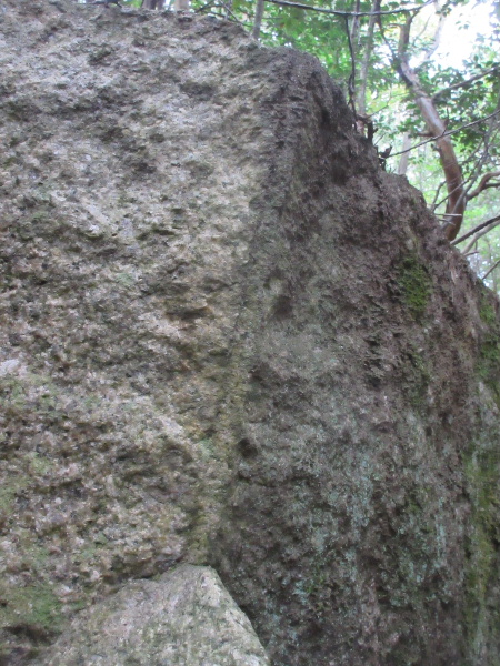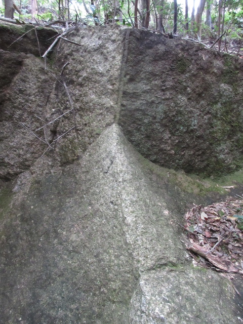 石材が採取された後の岩の形状は如何にも奇妙である。棒状の跡を境に両側は直交する平面であり、その下側は角度の異なる稜線となっている。岩肌も色彩も異なり、恰も異なる2つの岩がメリ込んでいるように見える。どうすればこのような断面ができるのか分からない。例えば間知石を採取しようとするために鑿を決められた方向にのみ宛てて鏨で叩き続ければ、ある程度整った平面を持つように割れてくれるのだろうか…