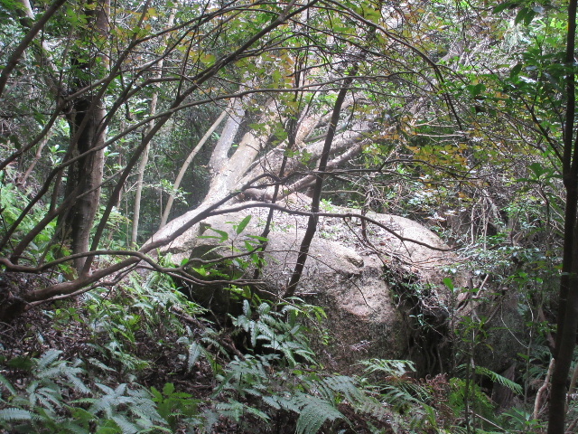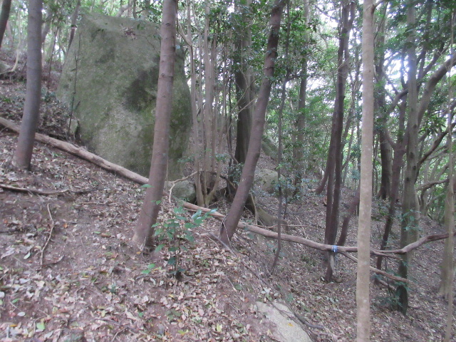 園路のないこの辺りの目標物としている一例として、鼻岩から高度を変えずに山裾を進んだところに大きな岩の下に目立つ根の形をした樹木がある。