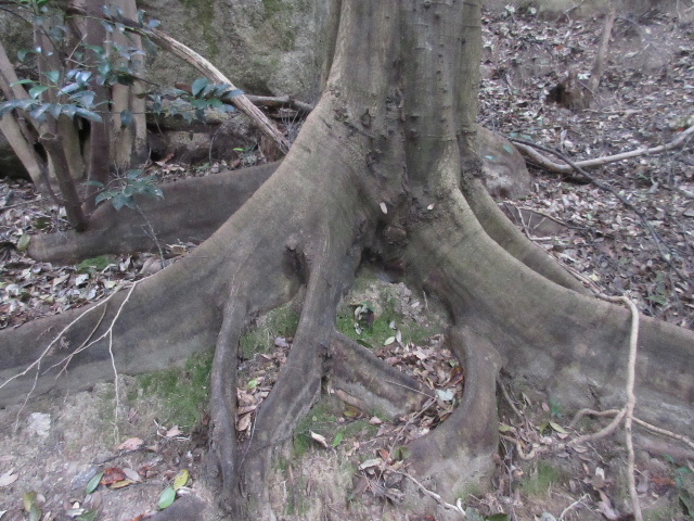 同様の樹木は園内他にも観測されている。この樹は特に大きく、更に大岩の下にあるので一つのランドマーク的存在となっている。この大木は「板根の樹」と勝手呼称されている。