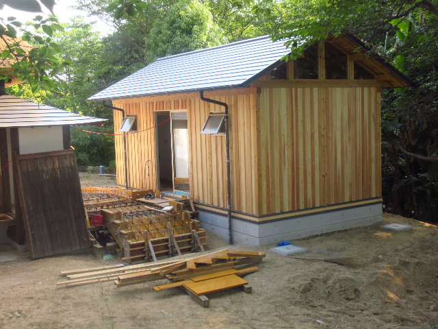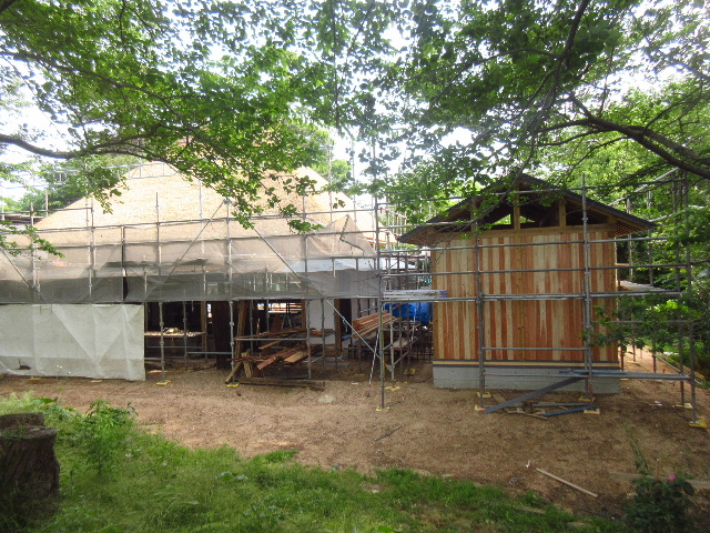 別棟は外壁がほぼ完成しサッシ窓が入っている。