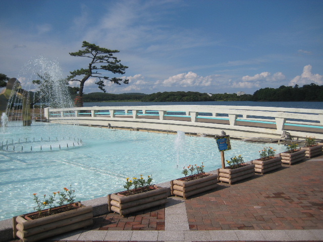 撮影アングルが今ひとつ良くないが、抜けるような青空…青々として水を湛える常盤池…白い欄干の眺橋に透明感あふれる噴水池。感動するほどに美しい。