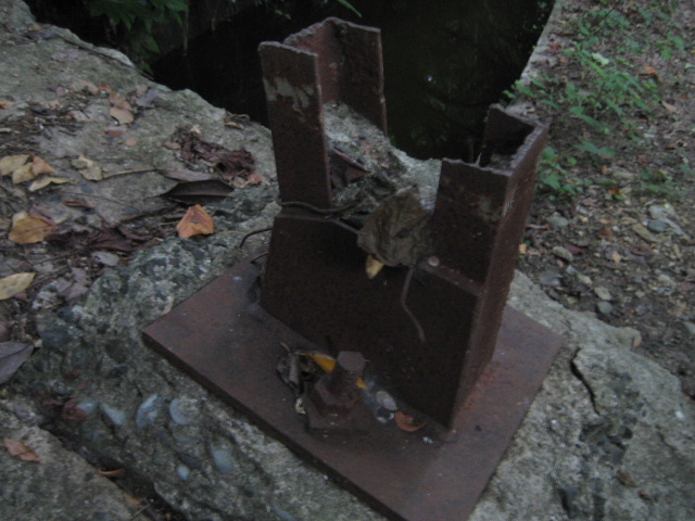 長方形のコンクリートの土台があり、その上にやや捻れてサイコロ状のコンクリート塊が乗っかっていた。コンクリートには鉄骨が埋め込まれていたものの、用済みになって切断されたらしい。