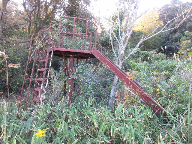 現在地は草が伸びるどころか樹木が入り込んで雑木林のようになっているが、元は南側斜面を一部切り崩して正方形をした公園だった。後年、ここが善和小学校の跡地だったことが判明した。明治16年に木田・山中・善和の小学校が合併したとき車地に小学校を建設し、その分教場を善和に設置したとある。[1] 明治30年に分教場が廃止されている[1]ので、その跡地に公園を造ったのかも知れない。児童公園の南側は粘性土剥き出しの斜面で、道は公園の山側を迂回する位置にあった。この道はかつて善和宰判勘定所につながっていたと思われる。公園から直接往来する道はないので、剥き出し斜面は公園造成のとき削ったのかも知れない。