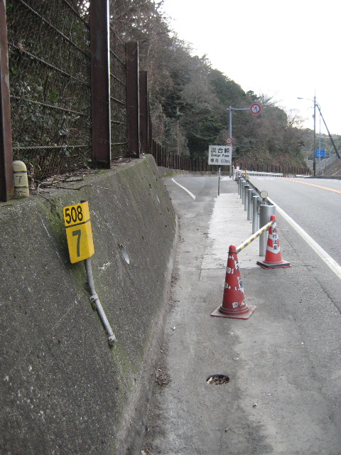 旧道の一部へ入り込まないようにコーンバーが置かれていた。