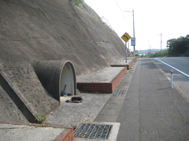 コンクリート吹き付けの斜面に何やらトンネルの坑口のようなものが見えている。