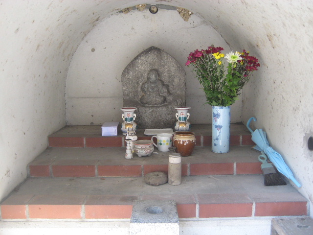 コンクリートとレンガで拵えた雛壇の奥に一体の石仏があり、花も生けてある。