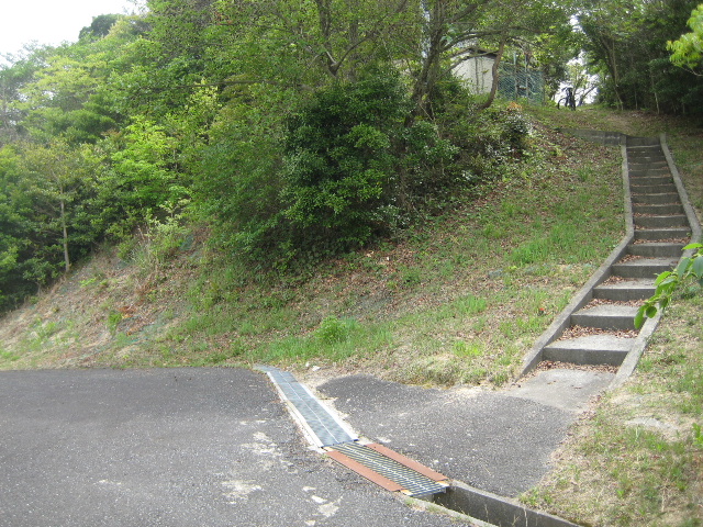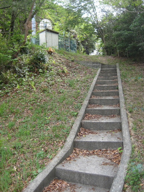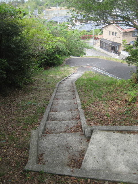 古めかしい山道はぷっつり切れ、幅1mくらいのコンクリート階段に変わっていた。かなり下の方には住宅の屋根も見えている。