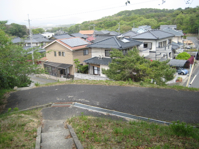 自転車を連れて行く意義を感じないので、階段に入る前で停め、単身歩いて偵察することにした。階段を下った先は車が乗り入れられるアスファルト路で、そこから更に家並み一軒分くらい低い場所に住宅地が広がっていた。