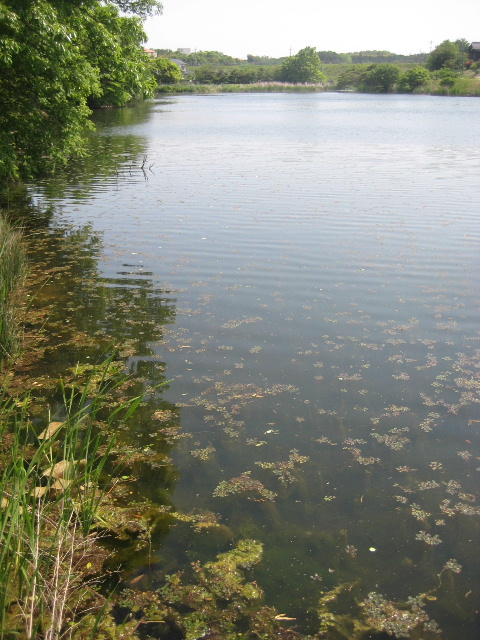 水面を撮影。水深は浅く夥しい水生植物が繁茂している。