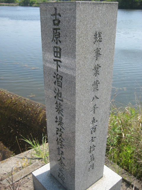 側面には平成5年3月31日の竣工年月日が彫られていた。このときに張りブロックや余水吐、フェンスを整備したのだろう。