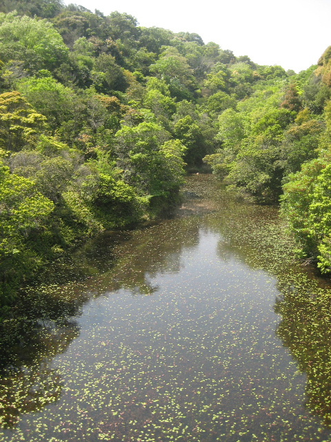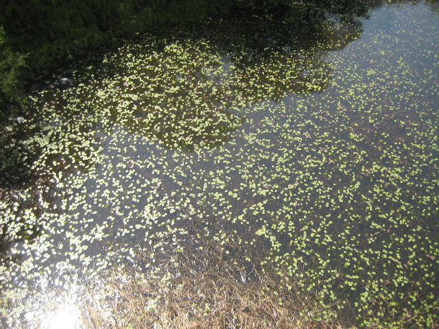 沢の末端部がそのまま溜め池の端で、浮き草類がもの凄い。