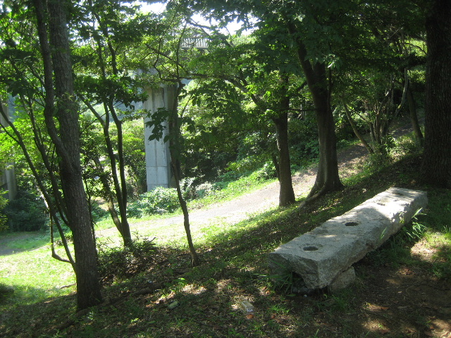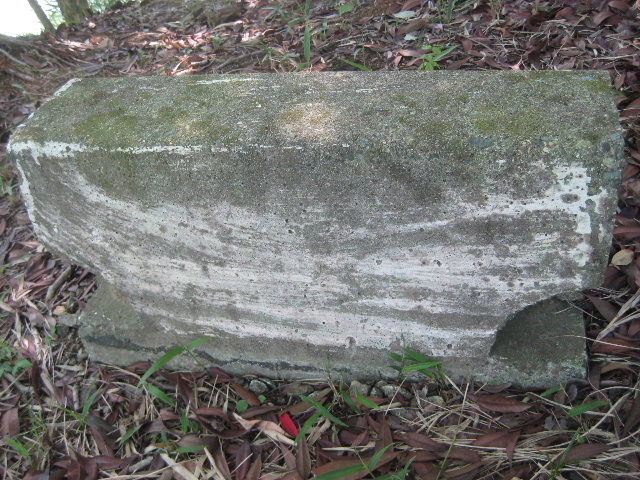 元々が道路関連の資材なので、溜め池の本土手に置かれているのは如何にも不自然である。市道小羽山中央線などの境界ブロックを更新したときの古いものか余った部材をベンチ代わりに置いたのだろうか。先の樋管よりも時代はずっと後のことで、腰掛ける人は居そうにない。