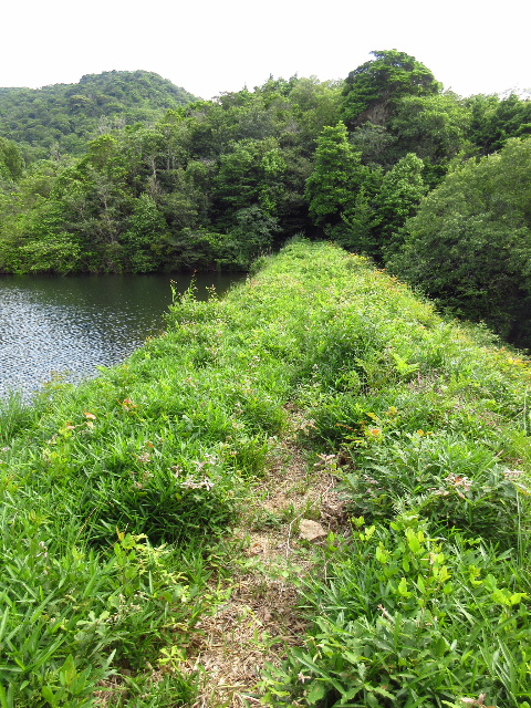 2018年6月に訪れたのが最初である。それ以前から厚東川1期工業用水道の桝や正覚寺跡は知っていて、川沿いの奥に溜め池があることは分かっていた。この頃には市内の主要な溜め池は一通り実地に訪れておこうという気があり、道をたどって奥まで進んだ。溜め池への到達が目的でありながら、前項で書いた石積みの分岐路を真っ直ぐ進んでしまい溜め池に出られず延々引き返していた。初回訪問時は水位が高く、堰堤の下へ降りることができなかった。しかし傍目にも美しい溜め池と感じた。人が訪れることが殆どないせいか堰堤の上は草が伸びていて先へ進むことなく溜め池のみ撮影して引き返している。