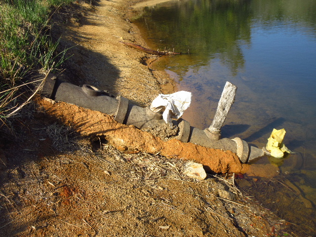 城ノ腰池は正確には3つの溜め池から成り、もっとも下流側にある池に堰堤が築かれている。樋門は堰堤の中ほどにあって、水位が下がると現れる。