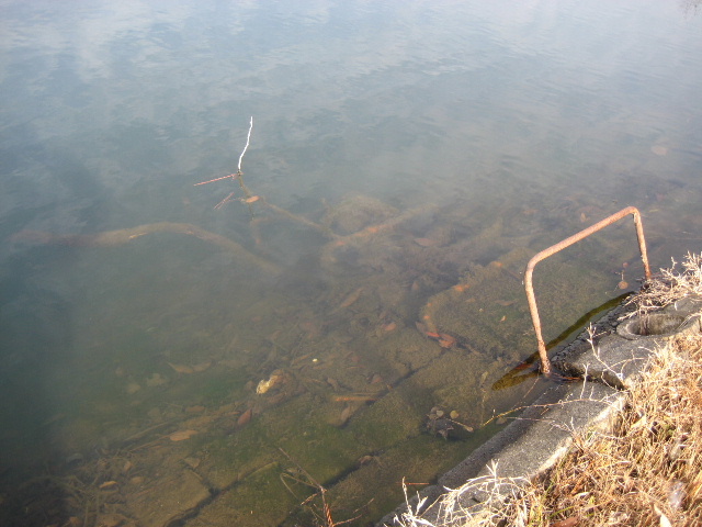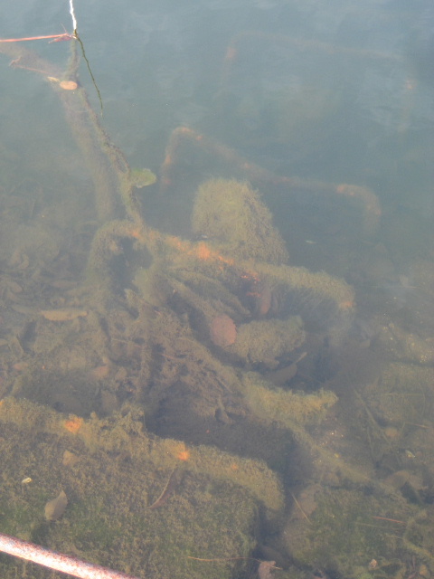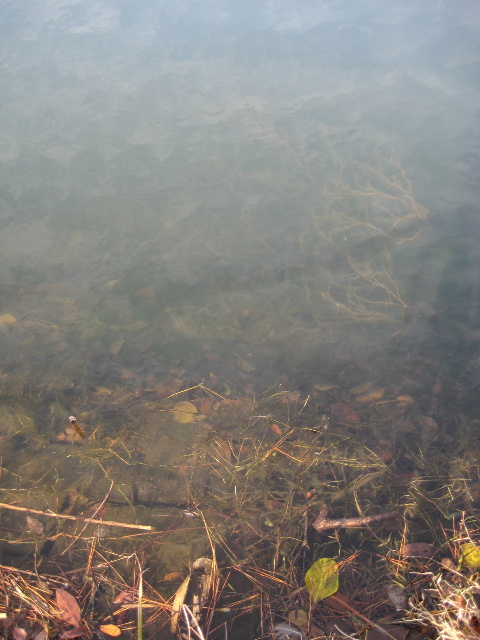 割と透明度がありながら先の方では既に水底が見えなくなっている。岸辺には藻や枯れ木が水没しているようだ。