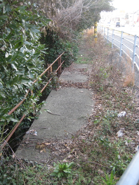 元の歩道は現在のより一段低くなっており、転落防止柵も低くて貧弱である。歩道の外側の木々がここまで伸びてきていた。