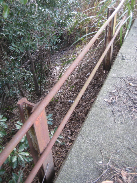 歩道の手すり部分の支柱は、何と廃レールの再利用だった。レールを歩道支持部分のコンクリート擁壁に取り付け、そこに単管パイプを柵代わりに3本掛けている。