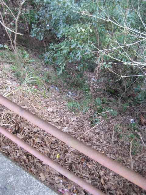 この歩道の外側が結構深い谷のようになっていることは、初めてこの歩道を自転車で通った3年くらい前から知っていた。その頃から既に木々が生い茂り、柵から外を覗き込まなければ状況が分からなかった。