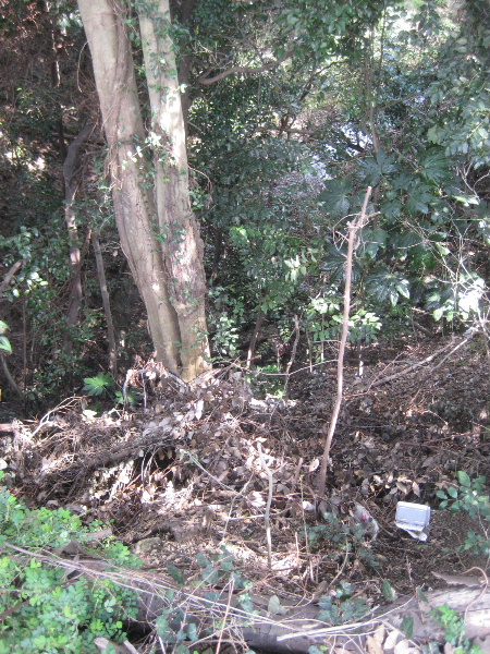 枯れ木やゴミなどが沢の斜面を覆っている。