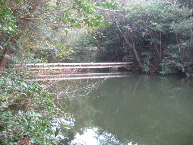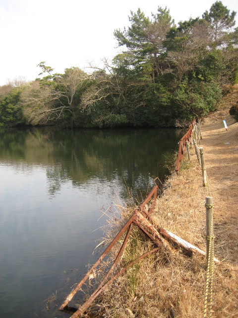 岸辺から急激に深くなっているのみならず、光の届く部分は藻が茂っていて足を取られる危険が想像される。遊泳中の事故が起きる以前に泳ごうという考え自体起きそうにもない危険な溜め池と言える。