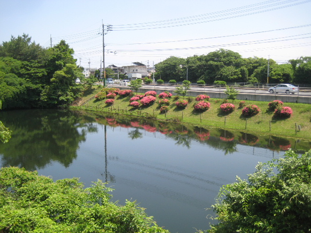 ・夫婦池の本土手斜面にはサツキツツジが植えられており、時期が来ればかなり壮観である。(写真は市道常盤公園江頭線側から撮影)