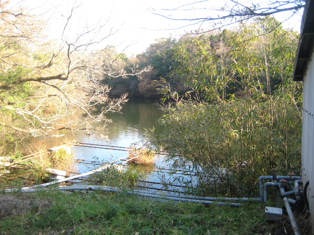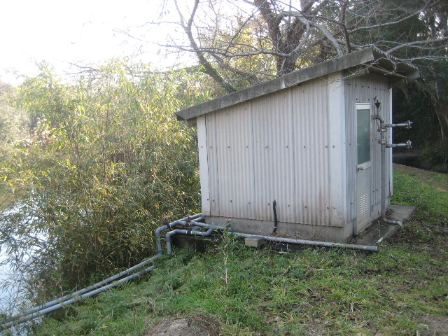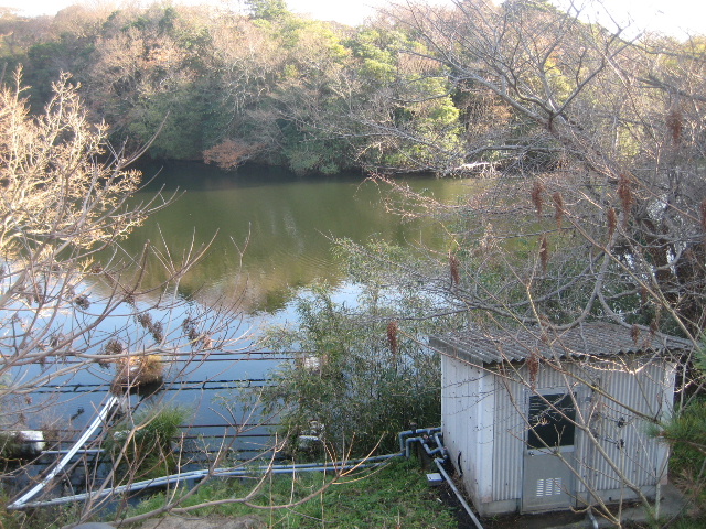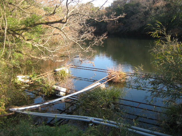 池の岸辺に骨組みだけになった筏らしきものが浮かんでおり、塩ビパイプが敷設してある。それは先のポンプ室に引き込まれていた。