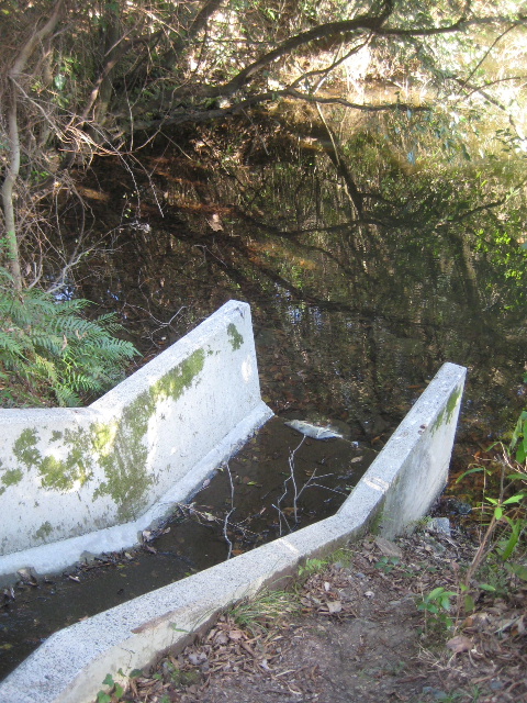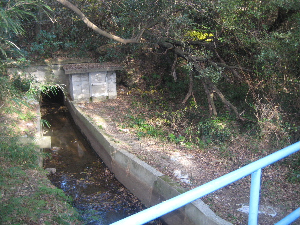 夫婦池側への流入口。コンクリート製の三面張り水路である。