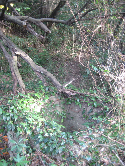 その横にある錆び付いたバルブの格納されているコンクリート桝。枯れ木がしだれかかっているが、汀に沿ってかなり明白な小道が見えていた。