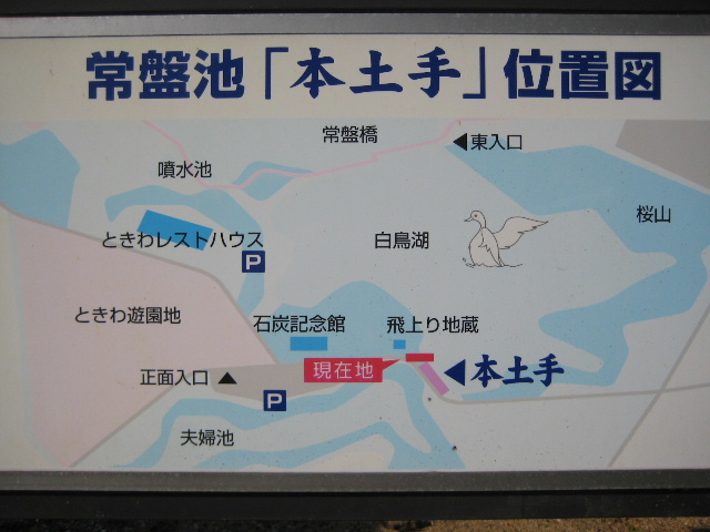 本土手の中央付近にはかつて松の木があり、市道常盤公園江頭線はそれを避けて上下線が分かれていた。確か夫婦松と呼ばれていたような気がする。その下にある池だから夫婦池という、案外そういう由来なのかも知れない。