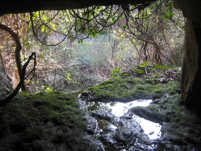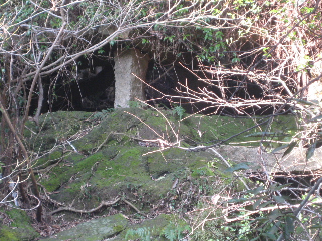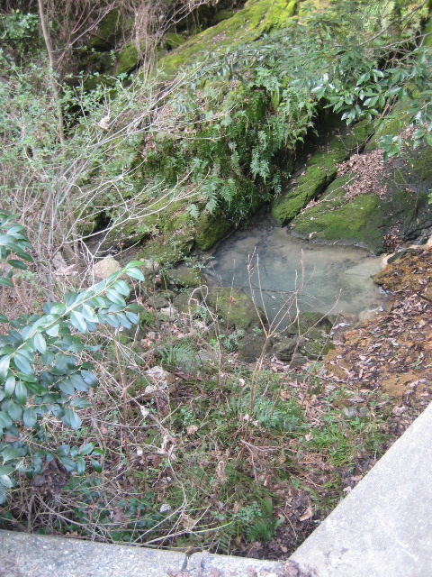 前回来たときは藪に隠れてまったく見えていなかった。あの半壊の石橋はもう少し入り江の中ほどにあるものと思っていたのである。溜まり水と思われていたあの窪地こそ、荒手の排水路が造り出した滝壺だったのだ。