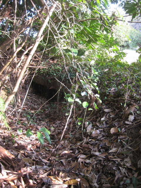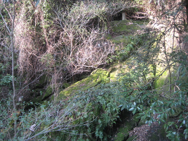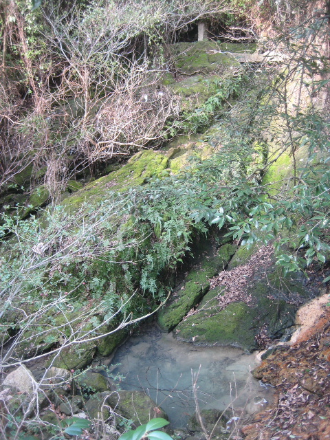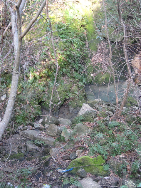 踏み跡に並行して小さな溝があった。初めて荒手を発見し内部へ降り立った後、壊れた石橋を見つけてその踏み跡の伸び先を調べて撮影した場所だ。