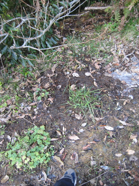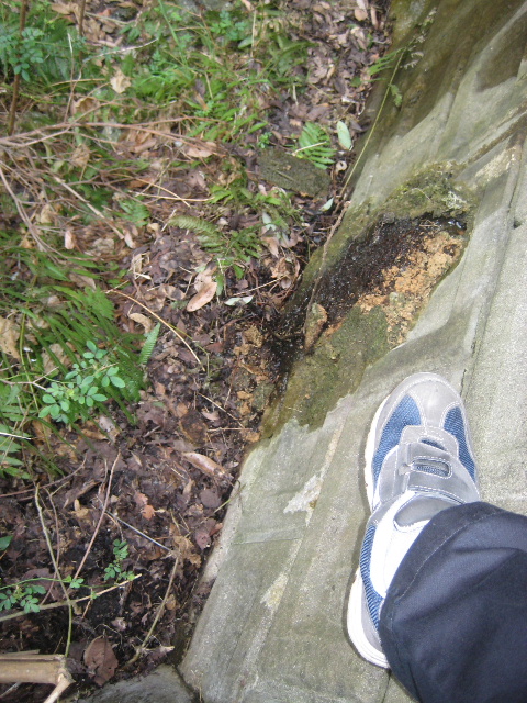 擁壁は途中から完全に木々の中へ埋もれていてその上を歩くことができず、沢へ流れ込む水は暗渠の他に地表も少し伝っていてスニーカーでは嵌るほど地面が緩かった。